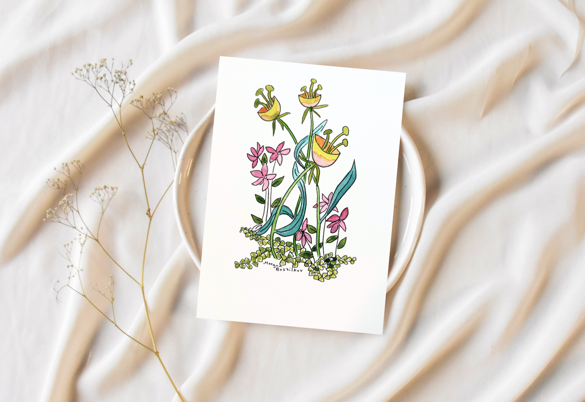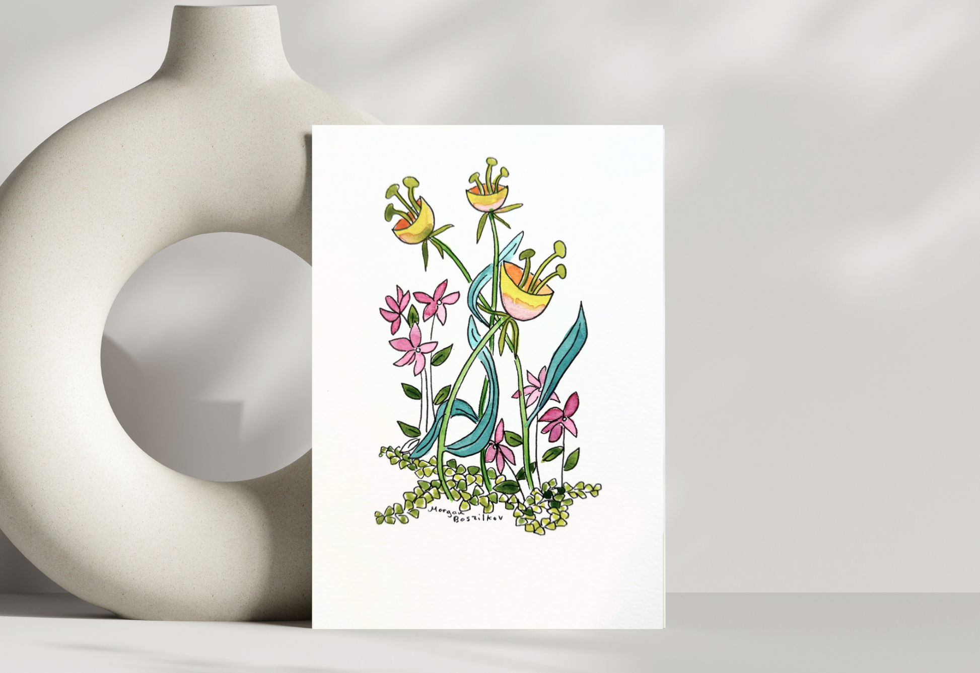 Graphic, imaginative, abstract bouquet of colorful, inviting botanicals