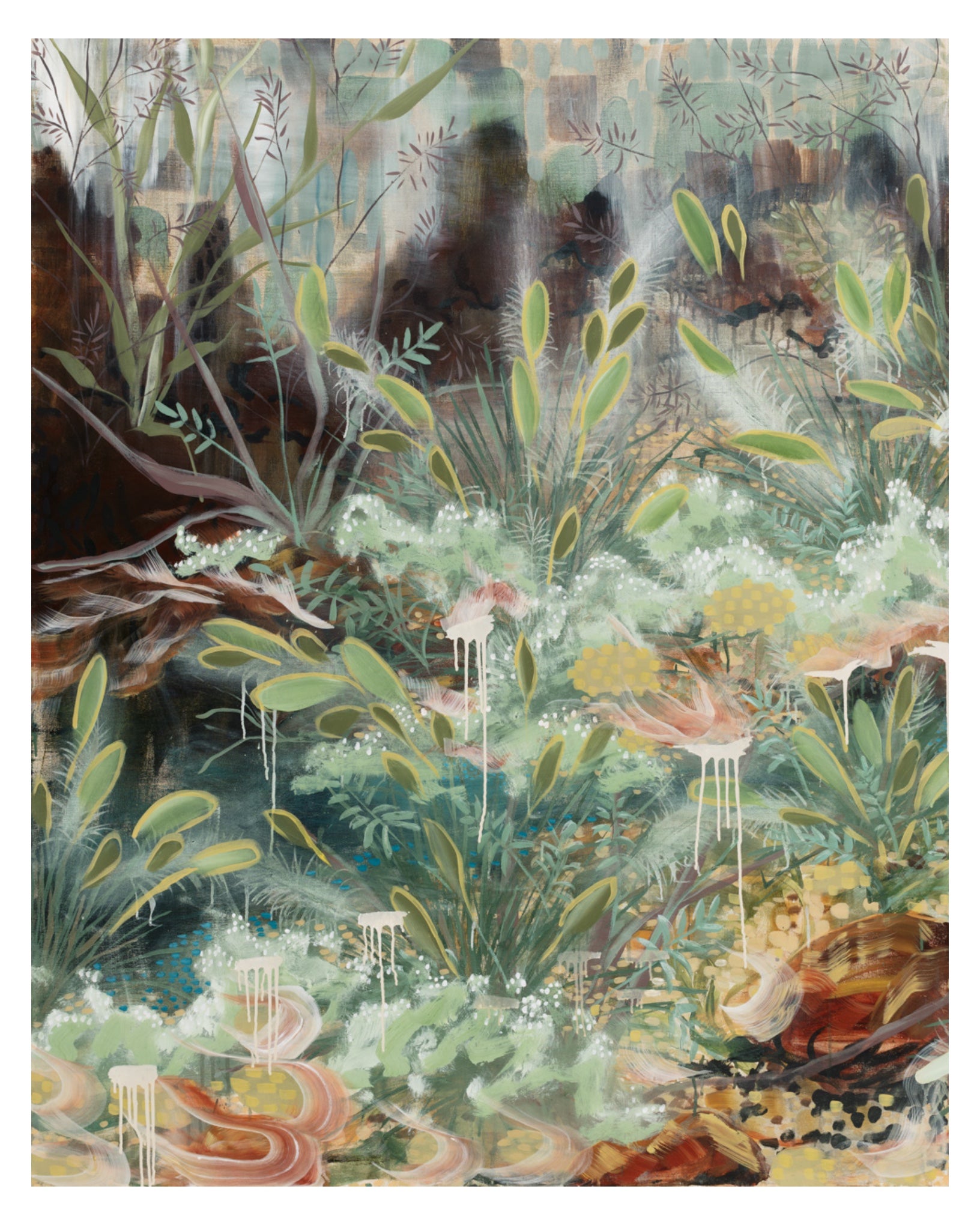 - Acrylic Painting: A dynamic abstract landscape that contrasts earthy depth with ethereal floral elements.