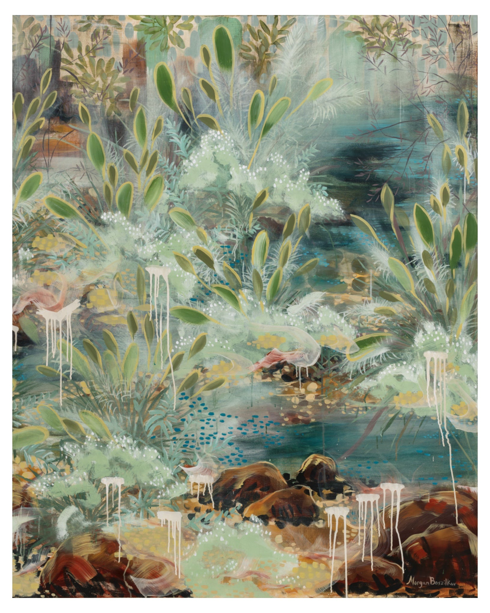 The composition emerged in a flow of channeling nature's beauty, resulting in a grand and compelling artwork that serves as a significant conversation piece. Bold brushstrokes create a sense of movement and energy, while delicate details and intuitively placed punctuations of thick paint add layers of complexity and texture.