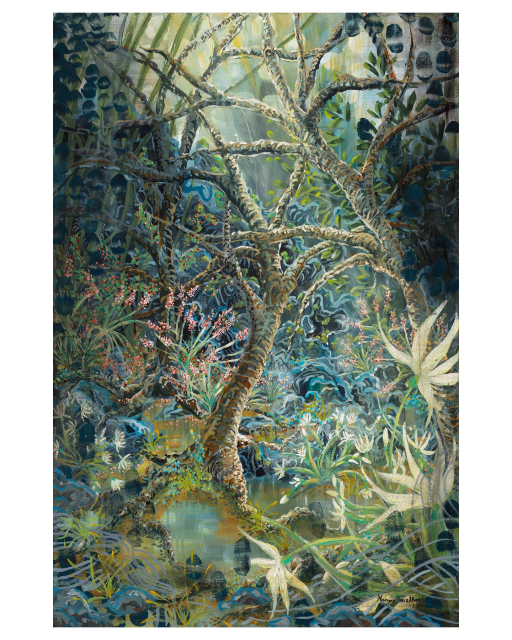 - Acrylic Painting: Richly detailed landscape with contrasting light and dark spaces come to life in vibrant acrylics on canvas.